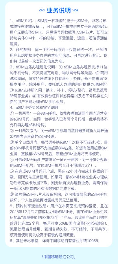 值得注意的是,中國移動還表示,eSIM業(yè)務(wù)商用試驗(yàn)期間僅支持通過線下自由營業(yè)廳辦理,用戶需到營業(yè)廳進(jìn)行預(yù)約登記,暫不支持委托代辦、線上辦理及境外用戶申請。