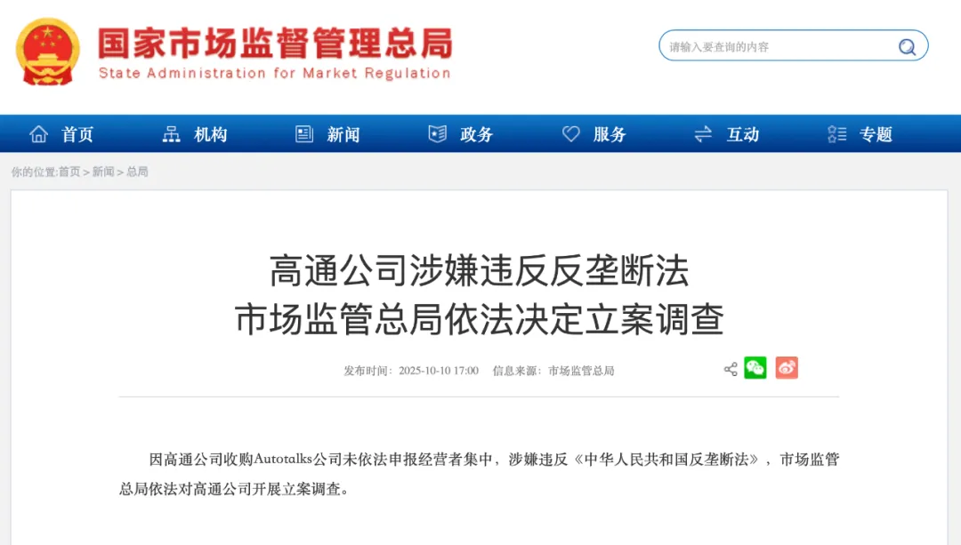 據(jù)國(guó)家市場(chǎng)監(jiān)督管理總局官網(wǎng)公示,因高通公司收購(gòu)Autotalks公司未依法申報(bào)經(jīng)營(yíng)者集中,涉嫌違反《中華人民共和國(guó)反壟斷法》,市場(chǎng)監(jiān)管總局依法對(duì)高通公司開(kāi)展立案調(diào)查。
