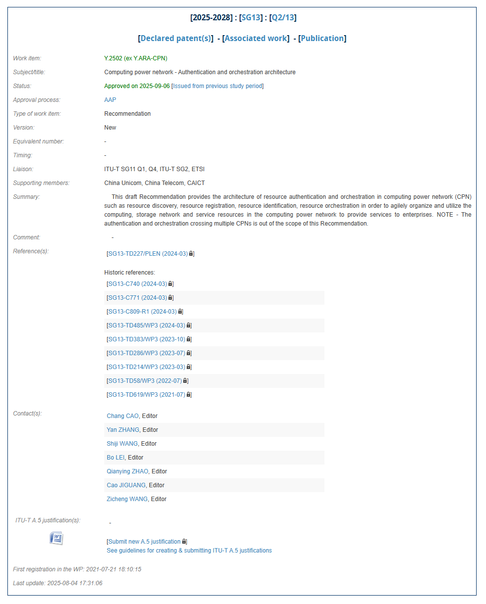 算力網(wǎng)絡(luò)的核心價(jià)值在于打破計(jì)算、存儲(chǔ)、網(wǎng)絡(luò)資源的孤島效應(yīng),實(shí)現(xiàn)跨域、異構(gòu)資源的敏捷組織與優(yōu)化利用。然而,多資源提供商共存、多管理機(jī)制并行、資源狀態(tài)動(dòng)態(tài)變化等特性,對(duì)資源合法性驗(yàn)證、高效調(diào)度編排提出了嚴(yán)峻挑戰(zhàn)。ITU-T國(guó)際標(biāo)準(zhǔn) Y.2502歷經(jīng)四年的技術(shù)研討、方案迭代與細(xì)節(jié)打磨,最終于 2025 年9月達(dá)成共識(shí)并獲得發(fā)布批準(zhǔn)。作為首個(gè)聚焦算力網(wǎng)絡(luò)資源認(rèn)證與編排的國(guó)際標(biāo)準(zhǔn),ITU-T Y.2502 明確了算力網(wǎng)絡(luò)資源認(rèn)證與編排的整體架構(gòu),涵蓋 CPN 編排層、CPN 資源層、CPN 服務(wù)層等核心功能,定義了資源發(fā)現(xiàn)、注冊(cè)、認(rèn)證、編排、信息獲取全流程服務(wù)邏輯,為不同廠商、不同類型資源協(xié)同提供了通用參考框架。